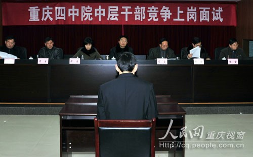 人民网重庆视窗3月7日电 (通讯员 艾庆平)今日上午,重庆市第四法院举行中层干部竞争上岗面试。根据该院《关于对部分处级领导职务实行竞争上岗的实施方案》中的规定,共有15名报名人员参加了面试。