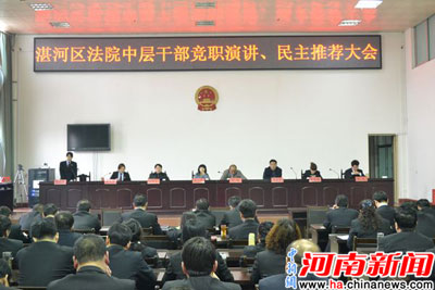 中新河南网平顶山4月2日电 (记者:邓超 通讯员:张春阳) 3月28日至3月30日,经过三天紧张激烈有序的工作,平顶山市湛河区法院中层干部竞争上岗、一般干警双向选择工作圆满结束。这次竞争上岗工作,院党组高度重视、精心组织,整个过程体现公开、公平、公正,始终保持充分的透明度,通过激烈竞争,使“人谋其位,位得其人”,机构设置更加规范,人员配备更加合理。