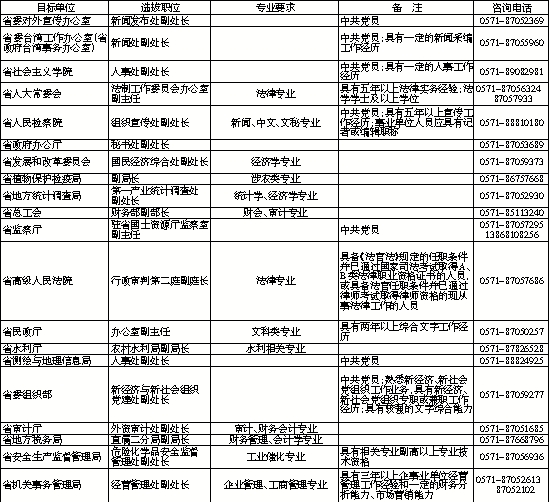 目标单位选拔职位专业要求备注咨询电话省委对外宣传办公室新闻发布处副处长中共党员0571-87052369省委台湾工作办公室(省政府台湾事务办公室)新闻处副处长中共党员;具有一定的新闻采编工作经历0571-87055960省社会主义学院人事处副处长中共党员;具有一定的人事工作经历0571-89082981省人大常委会法制工作委员会办公室副主任法律专业具有五年以上法律实务经验;法学学士及以上学位0571-87056324 87057933省人民检察院组织宣传处副处长新闻、中文、文秘专业中共党员;具有五年以上宣传工作经历;事业单位人员应具有记者或编辑职称0571-88810180省政府办公厅秘书处副处长0571-87053689省发展和改革委员会国民经济综合处副处长经济学专业0571-87059373省植物保护检疫局副局长涉农类专业0571-86757668省地方统计调查局第一产业统计调查处