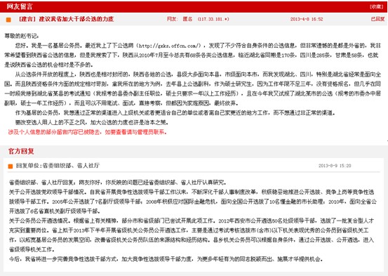 人民网西安8月15日电(樊昳杉)近日有网友留言反映,陕西省的公务员公选条件较为苛刻,该网友将陕西与邻省四川和湖北的公务员公选做了对比,发现陕西公务员选拔不仅条件苛刻,而且机会也相对较少,希望政府能够重视。8月9日,陕西省委组织部和陕西省人社厅就该问题给予回复,回复中称,陕西省将进一步完善竞争性选拔干部方式,加大竞争性选拔领导干部力度,为更多年轻有为的同志脱颖而出、施展才华提供机会。详情如下: